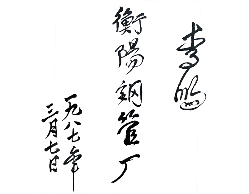李鵬同志在分管能源、重點建設項目等工作期間,曾親臨衡鋼指導工作。1987年3月7日,時任國務院副總理李鵬在湖南省領導陪同下來衡鋼視察。他深入老Φ108機組生產現場,走到軋機前、輥道旁,饒有興致地觀看和了解三輥穿孔、三輥軋管生產工藝,并察看了新Φ108機組項目建設情況。當時,衡鋼Φ108毫米三輥穿孔、三輥軋管技術攻關屬國家兩項重點科研項目,曾榮獲冶金部科技成果三等獎、湖南省科技成果二等獎。李鵬對衡鋼將科研成果轉換為生產力,走自主創新、自力更生發展之路給予高度贊賞和評價,并欣然題寫了“衡陽鋼管廠”廠名。